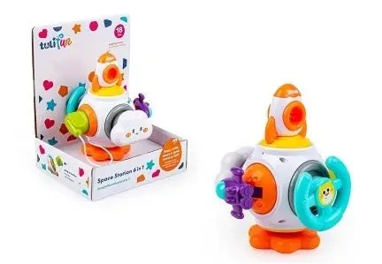 Misja kosmiczna ćwiczenie sprawności paluszków! Ta wielofunkcyjna zabawka wyposażona jest w wiele praktycznych zadań, z którymi dziecko może ćwiczyć motorykę małą. Znajduje się tu obrotowy ster, samolocik do przesuwania, wtyczka do wciskania, piszcząca chmurka, a także obrotowa gwiazdka, która jest zarazem ścianką, będącą podstawą zabawki. Po ustawieniu Stacji Kosmicznej na gwiazdce, można nią kręcić za pomocą paluszka. Kompaktowy rozmiar zabawki pozwala korzystać z niej zarówno w domu, jak i podczas podróży.