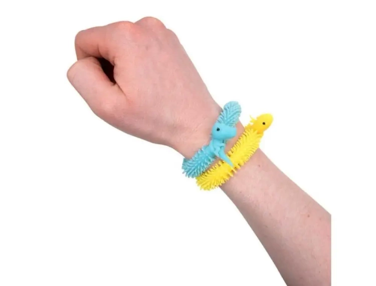 Zabawne rozciągliwe zwierzątka w formie włochatych bransoletek. Dostępne dwa wzory zwierzątek: dinozaur lub rekin w różnych kolorach: zielonym, żółtym lub różowym.