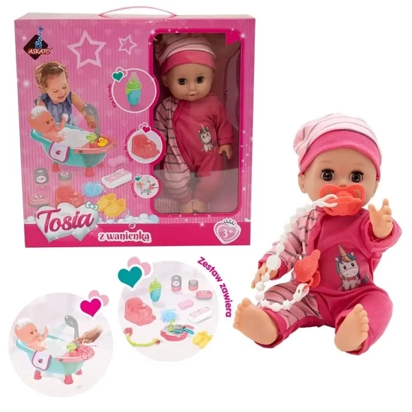 Lalka Tosia z wanienką w różowym ubranku - Askato