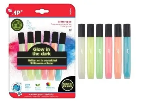 Formuła kleju pozwala na łatwe usunięcie go z większości tkanin, zapewniając wygodne użytkowanie. Kolory kleju świecą w ciemności, dzięki czemu Twoje projekty mogą zaskakiwać nawet po zmroku! Każda tuba zawiera 13 g kleju, dostępnego w egzotycznych kolorach: białym, żółtym, zielonym, różowym, pomarańczowym i niebieskim. Zestaw zawiera 6 takich tub.