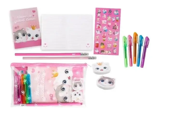 Zestaw zawiera różnorodne przybory, które ułatwią codzienne pisanie i notowanie. Wszystkie elementy ozdobione są uroczymi motywami kotków, które dodadzą uroku każdemu biurku. To doskonały wybór dla osób, które chcą, by ich przestrzeń pracy była nie tylko praktyczna, ale i pełna uroku.