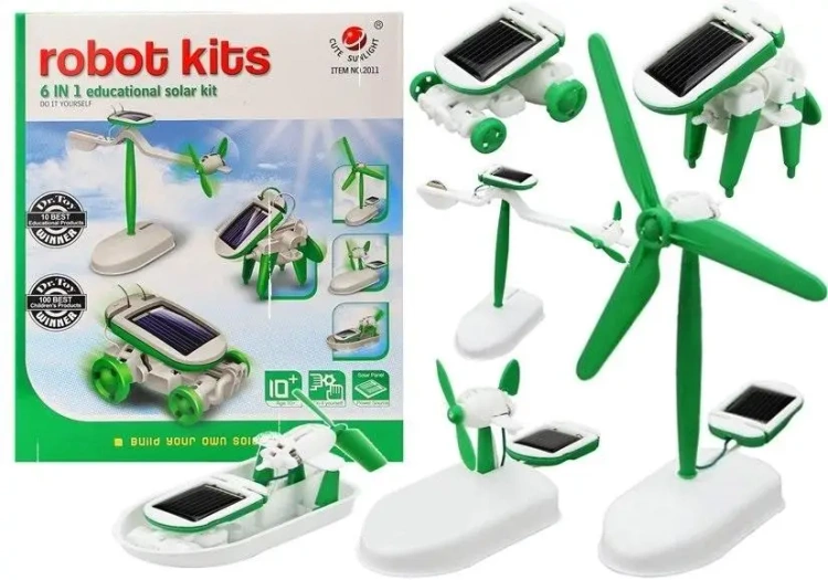 Kreatywny zestaw Robot Solarny 6 w 1 Robot Solarny to zabawka edukacyjno-interaktywna, która równocześnie bawi i uczy. Jest idealną propozycją dla małego ekologicznego naukowca, a przede wszystkim dla wszystkich dzieciaków ciekawych świata. Zestaw 6 w 1 to nie tylko świetna zabawa płynąca z podejmowanych prób konstrukcyjnych - ma również wymiar edukacyjny. Zestaw składa się z: - elementów konstrukcyjnych, - elementów elektronicznych, - panelu słonecznego, - ilustrowanej instrukcji obsługi zabawki. Prezentowany robot jest świetnym przykładem mądrego wykorzystania Słońca do zasilenia małego silnika. Wszelkie elementy robocika wykonane są z dużą starannością, dzięki czemu zabawka prezentuje się niebywale zjawiskowo, a zasilanie solarne sprawia, że jest zabawką przyjazną dla środowiska. Gdy dziecko będzie składać robota, wystarczy oświetlenie z 50-watowej żarówki halogenowej, jednak zabawkę najlepiej obsługiwać na zewnątrz podczas słonecznych dni. Wyposażenie zabawki: - panel z elementami konstrukcyjnymi, - elementy mechaniczne, - panel solarny, - obrazkowa instrukcja montażu. Czym wyróżnia się ten robot solarny? Składa się z kilkudziesięciu elementów, co nie tylko stanowi wyzwanie dla małego konstruktora, ale pozwala również na 6 różnych możliwości złożenia. Łączenie elementów zabawki jest bardzo bezpiecznym zajęciem - jej montaż nie wymaga kleju ani baterii, ponieważ zasilany jest energią słoneczną. Uważamy, że zabawa przedstawionym zestawem kreatywnym jest rewelacyjnym sposobem na wspólną zabawę w gronie najbliższych, dzięki której dzieci będą mogły spędzić więcej czasu z rodzicami. Wymiary zabawki: - samochód słoneczny: 6,9 cm x 4,9 cm x 3,5 cm, - słoneczny szczeniak: 6,6 cm x 6,5 cm x 4,6 cm, - słoneczna łódka: 12,2 cm x 7,6 cm x 6,2 cm, - słoneczny samolot: 15,1 cm x 8,9 cm x 6,2 cm, - wiatrak słoneczny: 19,5 cm x 14,9 cm x 13,6 cm, - słoneczny samolot obrotowy: 21,7 cm x 16,4 cm x 10,9 cm. Wymiary opakowania: 21 cm x 18 cm x 5 cm