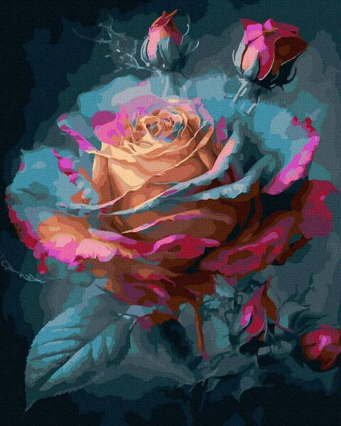 Romantyczna róża w niezwykłej kolorystyce róż, złoto i turkus. Elegancka dekoracja i relaksująca przyjemność malowania.