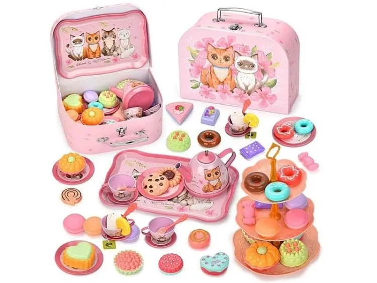 zestaw deserowy w kuferku, ciasteczka, filiżanki, metalowy; 25,5x18x9cm, Box