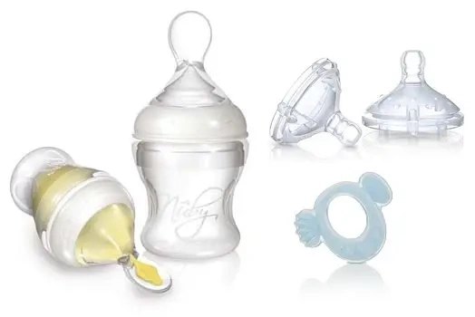 Silikonowa butelka posiada unikalną łyżeczkę do karmienia, która podobnie jak smoczki NubyTM wykonana jest z miękkiego silikonu. Ta wyjątkowa cecha pozwala na swobodne i łatwe przejście z karmienia płynnym pokarmem na stały pokarm. Miękka struktura silikonowa łyżeczki sprawia, że produkt ten jest bezpieczny dla wrażliwych dziąseł i ząbków dziecka.