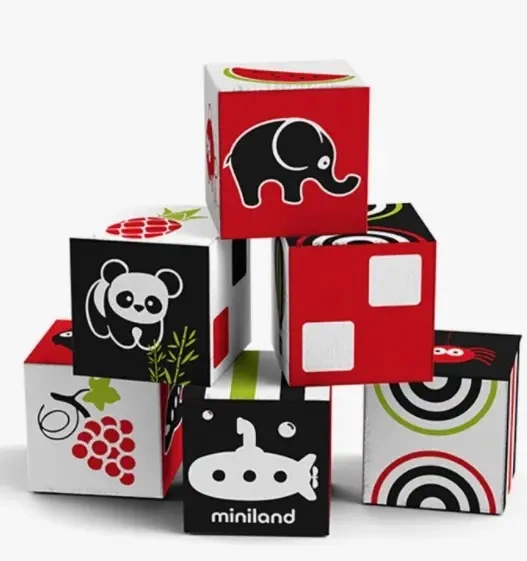 Małe klocki do układania w stos o stymulujących zmysły wzorach i kolorach. Miękka struktura klocków ułatwia dzieciom ich chwytanie. W każdym klocku wewnątrz znajduje się grzechotka.