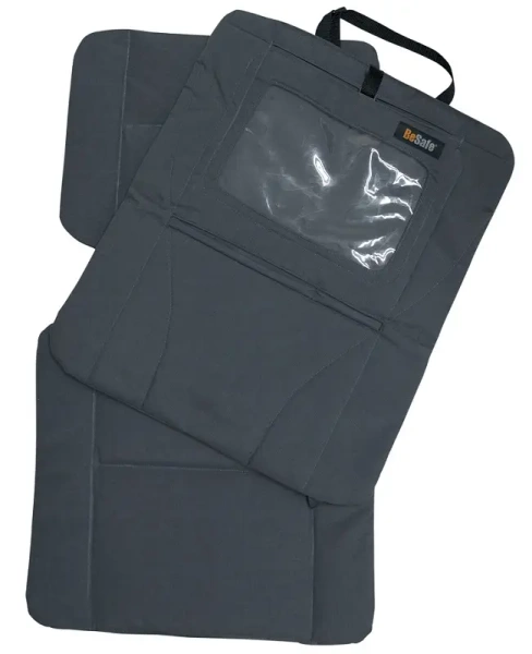 Dwuczęściowy ochraniacz fotela samochodowego z osobnym pokrowcem na tablet, który rośnie razem z dzieckiem ponieważ może zostać użyty do fotelików samochodowych wszystkich grup wiekowych.