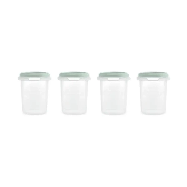 Kompletny zestaw 4 hermetycznych pojemników z podziałką o pojemności 250 ml każdy, z pokrywkami w kolorze miętowym. Szczególnie polecany do przechowywania, podgrzewania, zamrażania lub transportu mleka matki, pierwszej kaszki dziecka, a także wszelkiego rodzaju pokarmów stałych i płynnych.