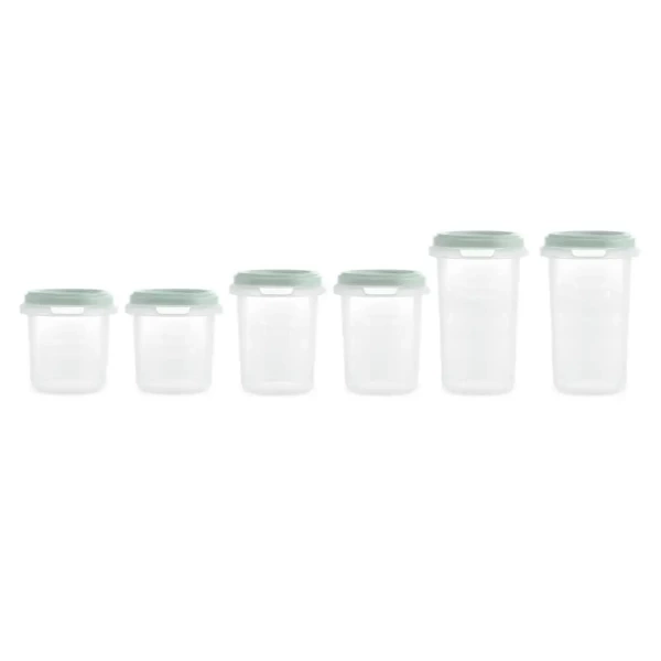 Kompletny zestaw 6 hermetycznych pojemników z podziałką o pojemności 200 ml, 250 ml i 300 ml, z pokrywkami w kolorze miętowym. Szczególnie polecany do przechowywania, podgrzewania, zamrażania lub transportu mleka matki, pierwszej kaszki dziecka, a także wszelkiego rodzaju pokarmów stałych i płynnych.