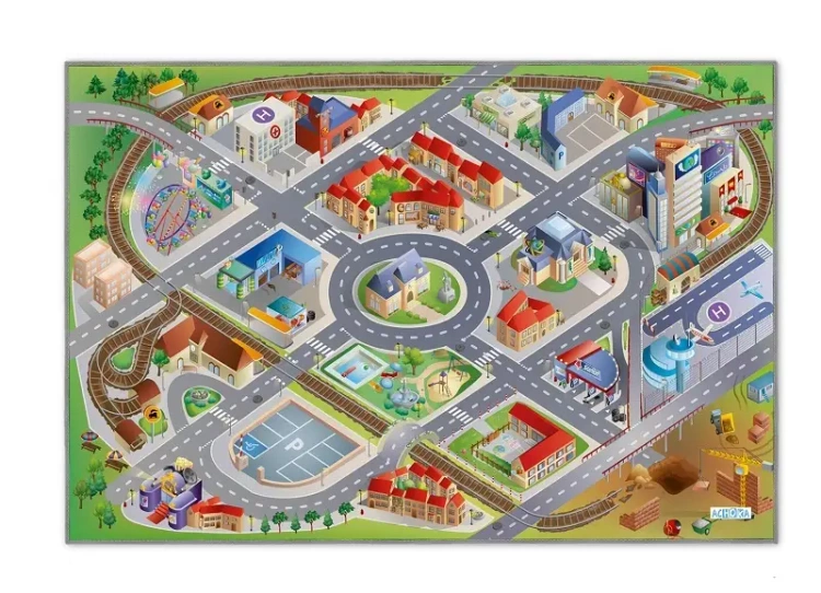Bawiąc się na dywaniku maluchy poczują się jak w mieście dzięki trójwymiarowemu nadrukowi. Na dywanie znajdą domy, tory kolejowe, drogi, parking, wesołe miasteczko oraz lotnisko. Mogą zaprosić do zabawy innych lub bawić się samemu. Mata zachęci Twoje dziecko do opowiadania, opisywania tego co widzi na dywaniku oraz wymyślania przygód.