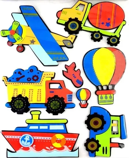 W zestawie 5 osobnych naklejek z wizerunkami różnych środków transportów: