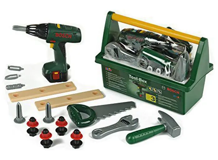 Skrzynka z narzędziami i wiertarko-wkrętarką Klein powstała na licencji Bosch, dlatego też narzędzia wchodzące w jej skład są wiernymi kopiami faktycznie istniejących narzędzi tej marki. Zestaw zapakowany jest w ciemno-zieloną pojemną skrzynkę na narzędzia. Skrzynka posiada żółtą wygodną rączką oraz dodatkową zawartość 7 elementów w komplecie. Głównym narzędziem skrzynki jest wiertarko-wkrętarka Bosch na baterie (KL 8402). Wiertarko-wkrętarka ma regulowane obroty w prawą i lewą stronę, włączane czerwonym przyciskiem, z boku zabawki, jak również dwie prędkości pracy, regulowane żółtym przełącznikiem na czole urządzenia. Dodatkowo narzędzie ma w komplecie cztery srebrne wymienne bity (wiertła), a także w pierścieniu narzędzia ukrytą diodę oświetlenie miejsca pracy. Wiertarko-wkrętarka podczas swojej pracy wydaje realistyczne dźwięki imitujące odgłosy pracy prawdziwego urządzenia. Ponadto w zestawie znajduje się piła ręczna, młotek, klucz francuski, dwie plastikowe deseczki z otworami do wkręcania śrub, a także 4 śruby z nakrętkami i 2 plastikowe gwoździe. Wszystkie elementy zestawu są wykonane z plastiku, pozbawione ostrych krawędzi i całkowicie bezpieczne dla dziecka. Dzięki wysokiej jakości wykonania śruby wkręca i wykręca się z dużą łatwością. Bawiąc się wiertarko-wkrętarką czy pozostałymi narzędziami skrzynki dzieci już od najmłodszych lat w bezpieczny sposób będą mogły wcielić się w rolę majsterkowicza, zapewniając sobie realistyczne doświadczenie korzystania z wszystkich jego części. Zestaw umożliwia maluchom kreatywną zabawę i doskonalenie umiejętności manualnych. Dzieci uwielbiają naśladować rodziców wykonujących codzienne czynności domowe lub w nich uczestniczyć, jednak nie zawsze jest to możliwe ze względów bezpieczeństwa, a dzięki tej całkowicie bezpiecznej dla dzieci, zabawkowej skrzynce z wiertarko-wkrętarką i narzędziami każdy mały majsterkowicz może bezpiecznie robić to, co jego opiekunowie. Zabawka wymaga użycia baterii, które nie są zawarte w zestawie.