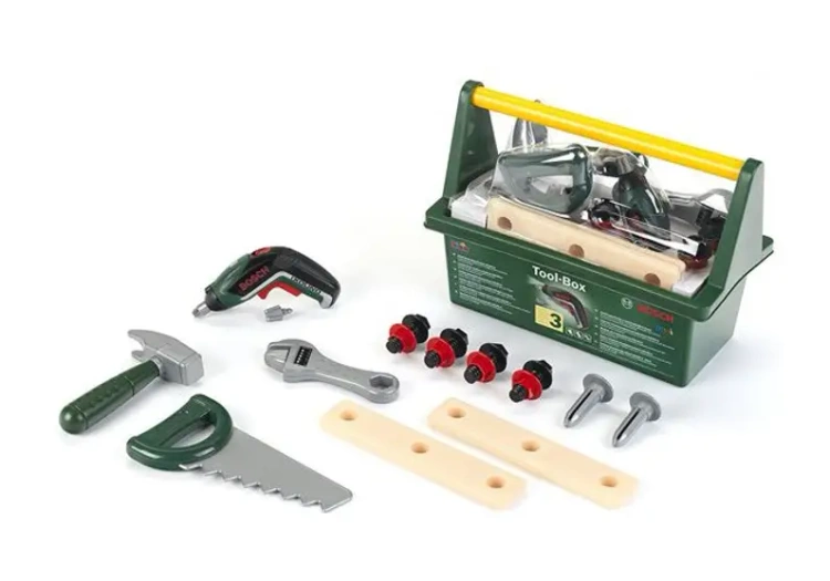 Skrzynka narzędziowa z wkrętarką marki Klein pochodzi z serii zabawek Bosch mini powstałej na licencji firmy Bosch, dlatego też narzędzia wchodzące w jej skład są wiernymi kopiami faktycznie istniejących narzędzi tej marki. Zestaw zapakowany jest w ciemno-zieloną pojemną skrzynkę na narzędzia. Skrzynka posiada żółtą wygodną rączką oraz dodatkową zawartość 7 elementów w komplecie. Głównym narzędziem tego kompletu jest bezprzewodowa wkrętarka na baterie (KL 8300) Bosch Ixiolino II z jednym dodatkowo wymiennym bitem. Wkrętarka jest solidnie wykonana z dużą dbałością o szczegóły, przez co wiernie naśladuje prawdziwe urządzenie. Wkrętarka jak prawdziwa ma wygodny uchwyt z gumową powierzchnią ułatwiającą utrzymanie zabawki w dziecięcych dłoniach, ma możliwość przełączenia za pomocą czerwonego przesuwaka obrotu końcówki w prawo i w lewo, a także diodę podświetlającą miejsce wkręcania, zamieszczoną nad bitem. Ponadto w zestawie znajduje się piła ręczna, młotek, klucz francuski, dwie plastikowe deseczki z otworami do wkręcania śrub lub wbijania gwoździ, a także 4 śruby z nakrętkami i 2 plastikowe gwoździe. Wszystkie elementy zestawu są wykonane z plastiku, pozbawione ostrych krawędzi i całkowicie bezpieczne dla dziecka. Dzięki wysokiej jakości wykonania wszystkie śruby wkręca i wykręca się z dużą łatwością. Bawiąc się narzędziami skrzynki dzieci już od najmłodszych lat w bezpieczny sposób będą mogły wcielić się w rolę majsterkowicza, zapewniając sobie realistyczne doświadczenie korzystania z wszystkich jego narzędzi. Zestaw umożliwia maluchom kreatywną zabawę i doskonalenie umiejętności manualnych. Dzieci uwielbiają naśladować rodziców wykonujących codzienne czynności domowe lub w nich uczestniczyć, jednak nie zawsze jest to możliwe ze względów bezpieczeństwa, a dzięki tej całkowicie bezpiecznej dla dzieci, zabawkowej skrzynce narzędziowej z wkrętarką każdy mały majsterkowicz może bezpiecznie robić to, co jego opiekunowie. Zabawka wymaga użycia baterii, które nie są zawarte w zestawie.