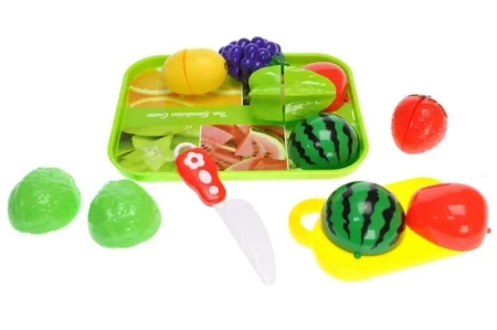 Zestaw owoców podzielonych na połówki, połączonych rzepami, z deską i nożem.