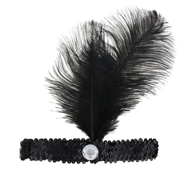 Opaska Retro - Kabaret, czarna Obwód opaski 50-60 cm Długość pióra 27 cm. Opaska w kolorze czarnym, zrobiona z elastycznej czarnej gumy. Zdobiona czarnymi cekinkami. Front opaski ozdabia jasny kamyczek w kształcie klejnotu. Dodatkowo, uroku dodaje jej grafitowe majestatyczne pióro.