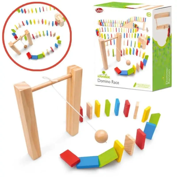 To kompletny zestaw pozwalający budować tory z domina o przeróżnych kształtach, które później należy przewracać. Opakowanie, to zestaw 200 kostek domina, w przeróżnych kolorach, które wykonane zostały z drewna. W zestawie znajdują się także elementy urozmaicające budowanie toru, takie jak mostek, schody dla domina czy obrotowe koło dla kostek. Tak bogaty zestaw daje wręcz nieograniczone możliowści tworzenia torów, a kupno kilku zestawów znacząco zwiększa warianty konstrukcyjne. Estetyczne pudełko o szerokości 24cm pozwala na przechowywanie wszystkich elementów wchodzących w skład zestawu.