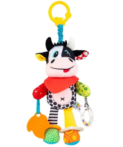 Z zawieszką w kształcie krówki każdy spacer zamieni się w wesołą przygodę! Zabawka wyposażona jest w obręcz pełną grzechoczących kuleczek i dwa miękkie gryzaki, które przynoszą ulgę podczas ząbkowania. Jeden z nich ma kształt listka i doczepiony jest do łapki zwierzaka, drugi ma kształt bandany z wypustkami, która zdobi krowią szyję. Pluszak został wykonany z materiałów różniących się kolorem, wzorem i fakturą, przez co stymulować będzie malucha do sensorycznego odkrywania świata i rozwijania zdolności poznawczych. Zabawka posiada praktyczną zawieszkę, dzięki czemu można ją przymocować w dowolnym miejscu, aby mogła wszędzie towarzyszyć bobasowi.