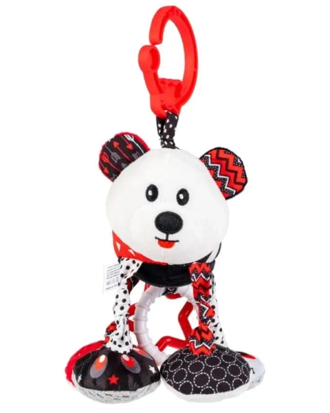 Mały towarzysz wycieczek zainspiruje bobasa do sensorycznej zabawy! Misiek w kontrastowych kolorach posiada doczepione zawieszki w kształcie gwiazdki i kółeczka. Zabawka została uszyta z materiałów różniących się kolorem, wzorem i fakturą, co pozwoli najmłodszym rozwijać zdolności poznawcze, stymulując przy tym zmysł wzroku i dotyku. Pluszak wyposażony został w funkcję wibracji. Wystarczy pociągnąć miśka w dół, a podciągnie się z powrotem na materiałowej harmonijce, zabawnie przy tym wibrując. Zabawka posiada praktyczną zawieszkę, która umożliwia jej zaczepienie w dowolnym miejscu.