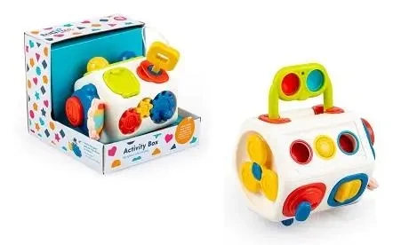 Podręczna skrzyneczka, wypełniona po brzegi zadaniami, aktywizującymi rączki malucha! Każda ze stron to inna, zręcznościowa zabawa. Jest tu włącznik do przesuwania, przycisk do klikania, wiatraczek, którym można kręcić za pomocą paluszka, trybiki i kluczyk do przekręcania, kuleczka do przesuwania i dwie kuleczki pop it do wciskania. Rączka skrzynki jest wysuwana, więc stanowi zarazem praktyczny uchwyt, ułatwiający przenoszenie zabawki.