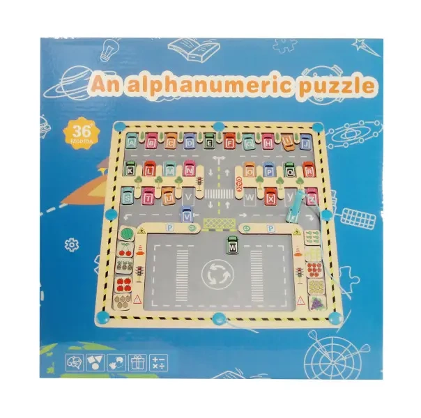 Gra edukacyjna alphanumeric puzzle. Plansza z kolorowymi elementami do układania liter i cyfr. Zabawka przeznaczona dla dzieci od lat 3. Produkt zapakowany w kartonowe pudełko. Podane wymiary stanowią wymiar opakowania.