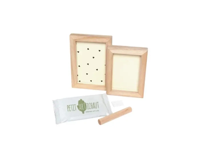 Ramka na zdjęcie i odcisk to doskonałe połączenie elegancji i funkcjonalności, pozwalające na wyeksponowanie zarówno zdjęcia dziecka, jak i jego odcisku. Stojąca ramka dodaje uroku każdemu wnętrzu. Dzięki odwracalnej wkładce w kolorze beżu, którą można wybrać z motywem serc lub w wersji gładkiej, łatwo dopasujesz ramkę do swojego gustu. W zestawie znajduje się hipoalergiczna glinka, wałek oraz instrukcje, które ułatwią wykonanie odcisku.