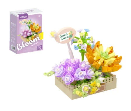 Klocki przedstawiają sukulenty w ozdobnej doniczce.