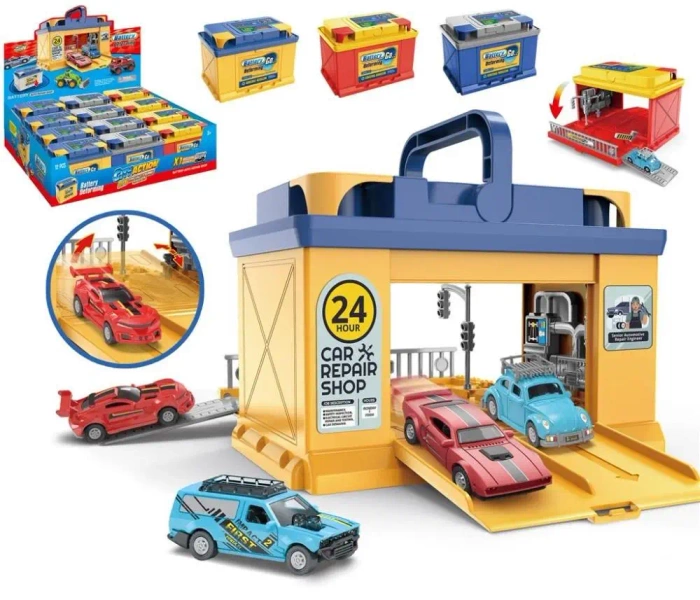 Warsztat-parking w kształcie akumulatora samochodowego z wygodną rączką do przenoszenia. W zestawie auta.