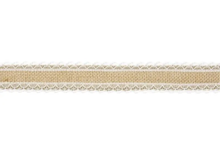 Taśma jutowa z białą koronką, szerokość ok. 4 cm, długość ok. 5 m.