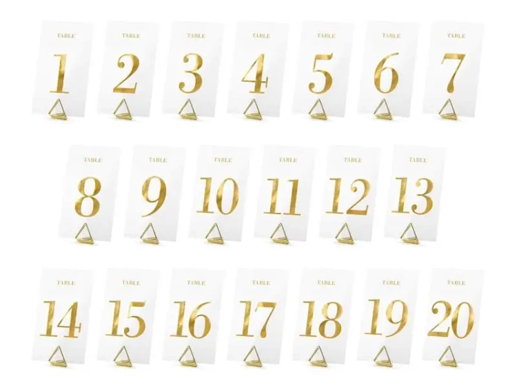 Numery na stół wykoane z transparentnej folii z złotym metalizowanym nadrukiem cyfr, zestaw zawiera numer od 1 do 20, rozmiar ok. 7 x 12 cm.(1 op. / 20 szt.)