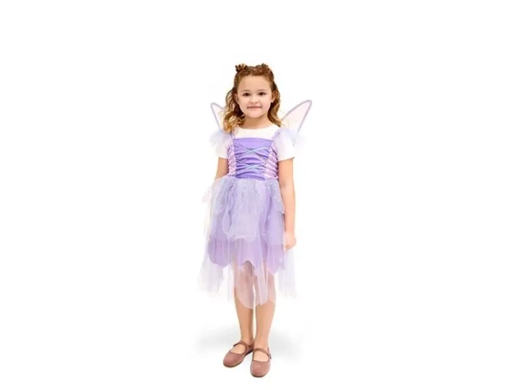 Strój Wróżka ze skrzydłami, rozmiar 116-128 cm (5-8 lat). Zestaw zawiera sukienkę w kolorze fioletowym z niebieskimi tiulowymi wstawkami oraz skrzydła z siateczki mocowane na rzep do pleców sukienki. Skład 100% poliester. Wymiary produktu: sukienka: długość 88 cm, obwód w pasie 60 cm, skrzydła 41x45,5 cm