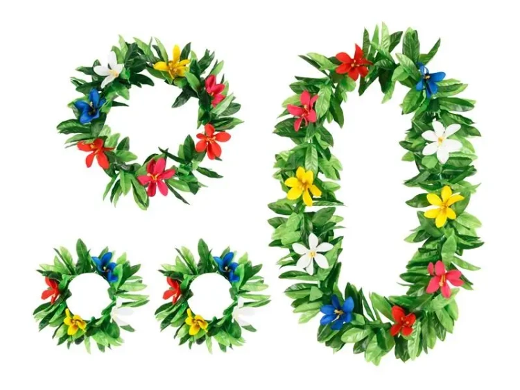 Zestaw hawajski, rozmiar uniwersalny dla osoby dorosłej. Zestaw zawiera naszyjnik, opaskę na głowę oraz 2 bransoletki. Akcesoria wykonane z zielonych materiałowych liści z dodatkiem kolorowych materiałowych kwiatów.