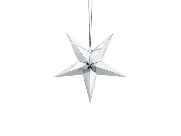 Gwiazda papierowa pięcioramienna wykonana ze srebrnego lustrzanego papieru, ze srebrnym sznurkiem, średnica ok. 30 cm. Produkt do samodzielnego złożenia.