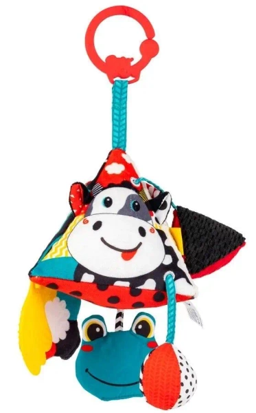 Razem z wesołymi zwierzakami odkryj radość z sensorycznej zabawy! Na kontrastowej piramidce ukryło się wiele niespodzianek, a wśród nich bezpieczne lusterko do samopoznania malucha, piszczałka, tasiemki do przeciągania z materiałowymi zabaweczkami oraz gryzak w kształcie żółciutkiej kiści bananów, który z pewnością przyda się każdemu ząbkującymi bobasowi. Zastosowane w piramidce materiały różnią się zarówno fakturą, jak i wzorem czy kolorem, dzięki czemu podczas zabawy, będzie ona stymulować zmysły malucha i pomagać mu w rozwijaniu zdolności poznawczych. Praktyczna zawieszka, w którą wyposażona została zabawka, pozwoli zawiesić ją w wybranym miejscu.