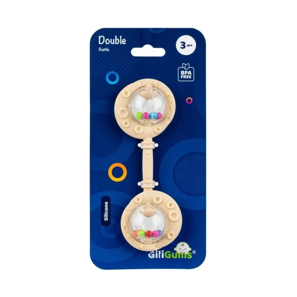 Pomysłowa zabawka w kształcie sztangi grzechocze podwójnie, zapewniając dwa razy lepszą frajdę! Wyposażona została w dwie kule wypełnione kolorowymi koralikami, które przy potrząsaniu wydają wesoły dźwięk. Obie kule otoczone są miękkimi pierścieniami z wypustkami o zróżnicowanych kształtach, które będą stymulować zmysł dotyku malucha, a podczas gryzienia, będą delikatnie masować obolałe ząbkowaniem dziąsła