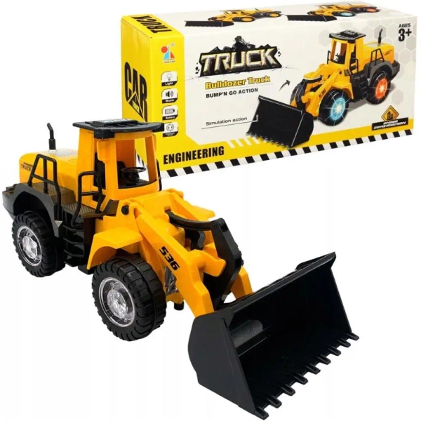 Spychacz z ruchomymi elementami oraz światłem i dźwiękiem.