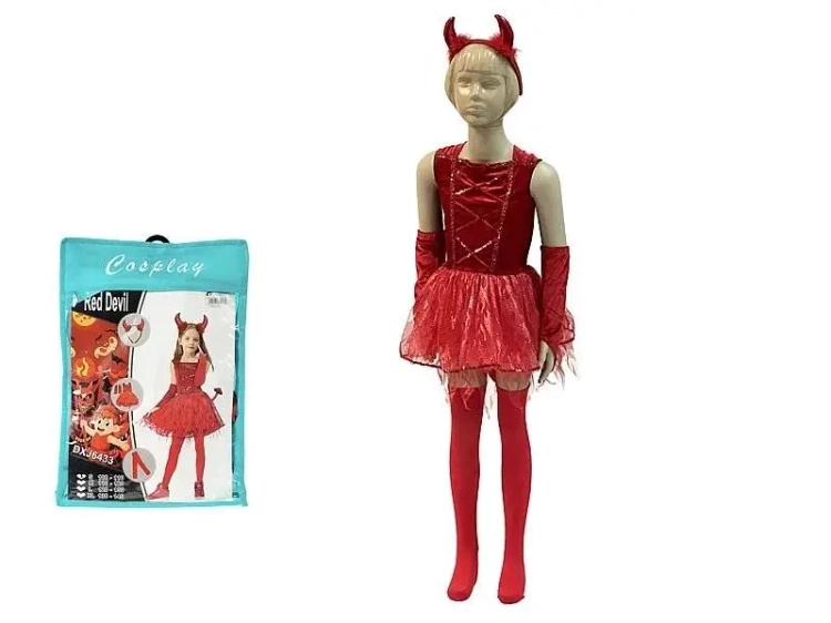 Strój karnawałowy, diablica, 6 części (sukienka, rękawiczki, pończochy, opaska) rozmiar S 100-110cm