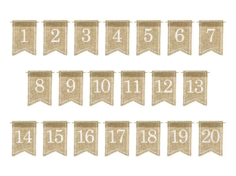 "Numery na stół wykonane z juty z białym nadrukiem, zestaw zawiera numery od 1 do 20 na sznurku, wymiary: szerokość ok. 7 cm, wysokość ok. 10,5 cm, długość całkowita ok. 37 cm. (1 op. / 20 szt.)"