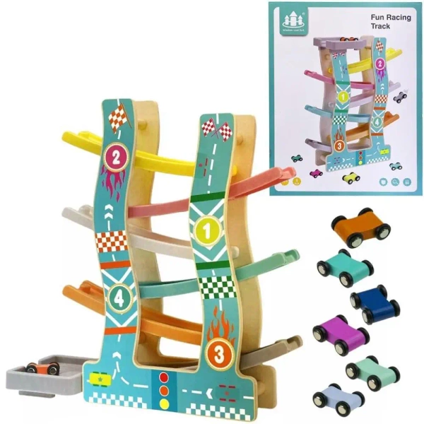 Drewniana zjeżdżalnia rozwija umiejętności motoryczne, koordynację i kreatywność dziecka. Drewniana zabawka to tor wyścigowy składający się z 6 poziomów i 6 samochodzików, które można puszczać z góry na dół. W ten sposób dziecko uczy się wielu umiejętności manualnych i rozwija między innymi umiejętność liczenia. Minimalistyczny design w stonowanych kolorach będzie się dobrze prezentował w każdym dziecięcym pokoju.