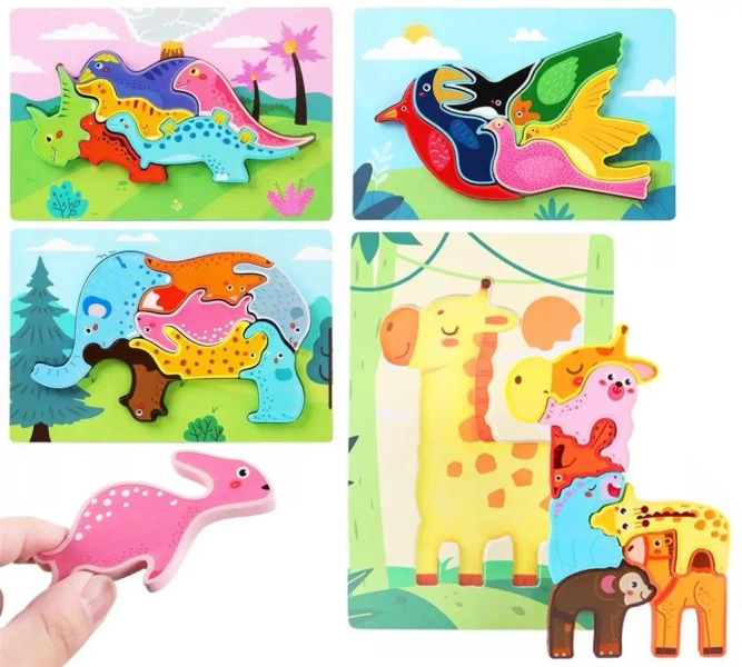 Drewniana układanka zwierzęta w której na podstawie wzoru można ułożyć jedno duże zwierzę z kilku mniejszych.