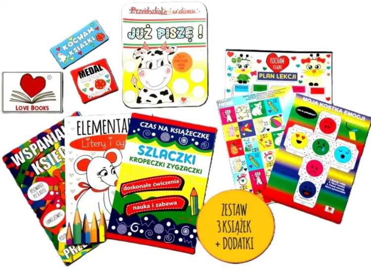 PRZEDSZKOLE W DOMU. JUŻ PISZĘ ! ZESTAW 3 KSIĄŻEK Z DODATKAMI Super zestaw 3 książek dla dzieci w wieku przedszkolnym. W zestawie następujące książki: WSPANIAŁA KSIĘGA PRZEDSZKOLAKA ELEMENTARZ LITERY I CYFRY SZLACZKI KROPECZKI ZYGZACZKI W zestawie dodatkowo znajdują się naklejki, gra Piotruś do wycinania i zabawy, Wycinanka- kostka emocji, plan lekcji i zabawy. Zestaw zapakowany w foliowy worek.