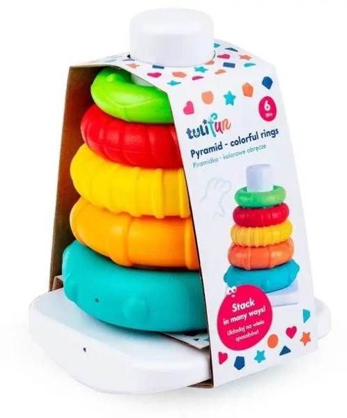 Pięć kolorowych obręczy, a każda z nich w innym rozmiarze, kolorze i z innymi wypustkami! Ułóż z nich kolorową piramidkę, budując ją od największej obręczy do najmniejszej. Pomoże w tym podstawka z drążkiem, na którą należy natykać obręcze, jedną po drugiej. Kiedy piramidka będzie gotowa, wystarczy zsunąć z niej kolorowe krążki, aby rozpocząć zabawę od nowa. Zróżnicowane faktury obręczy stymulować będą zmysł dotyku malucha, pozwalając mu przy tym rozwijać zdolności poznawcze.