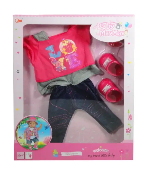 Ubranko dla lalek w skład którego wchodzą jeansy, bluzka, okulary i buciki.