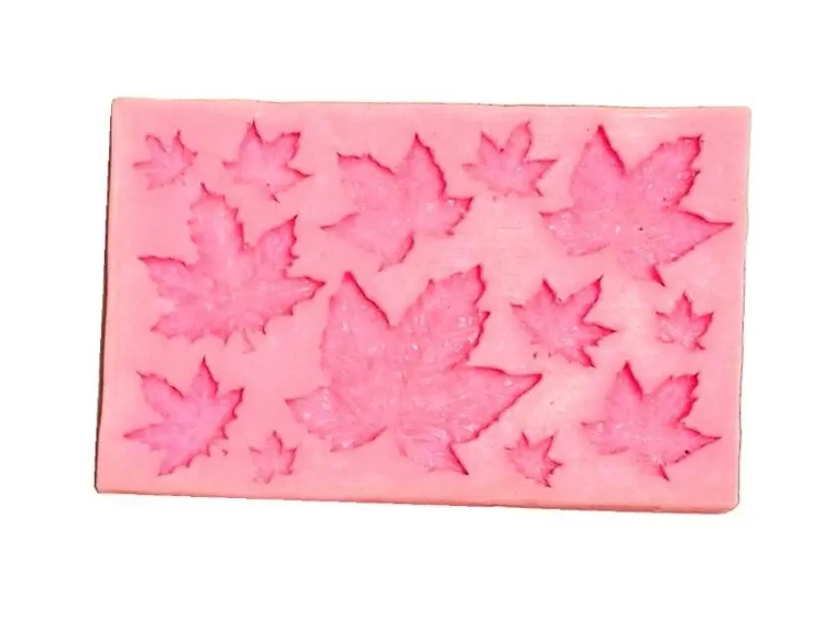 Forma silikonowa wielkości 6 cm x 9,5 cm do odlewów z gipsu, mas plastycznych, plasteliny, modeliny, mas cukierniczych itp.Z formy jest możliwość odlania lub stworzenia 13 elementów w kształcie liści klonu.