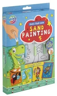 Nowa, kreatywna forma spędzania czasu dla dzieci-obrazki do pokrywania kolorowym piaskiem. Obrazki zawierają pola pokryte klejem, które po ich odsłonięciu można posypywać piaskiem i w ten sposób je kolorować. Każdy obrazek to kolejna okazja do wyboru najciekawszych połączeń kolorów. Zestaw zawiera: