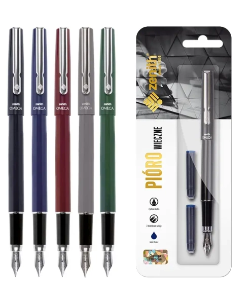 Pióro korzysta z wymiennych nabojów atramentowych w kolorze niebieskim, co zapewnia wygodę i długotrwałe użytkowanie. Dostępne jest w różnorodnych kolorach: czarnym, granatowym, bordowym, popielatym oraz zielonym, przy czym dostarczane są losowo.