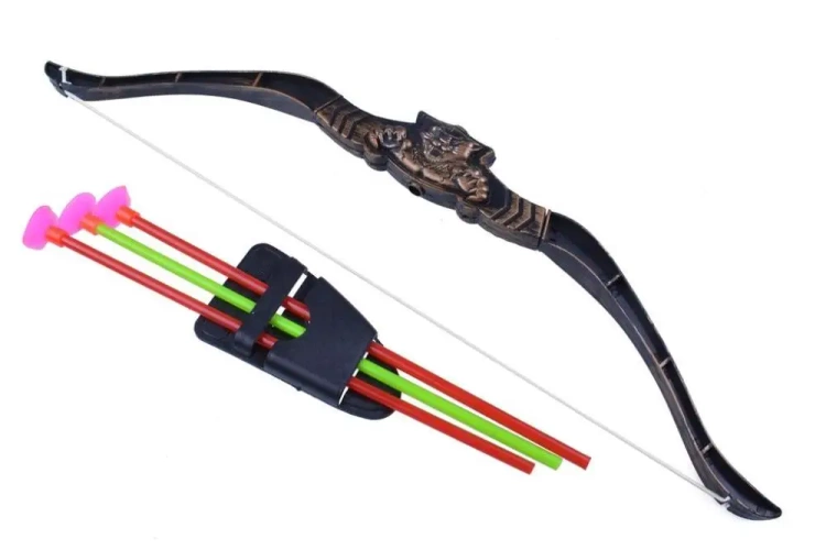 Uzupełnienie stroju Indianina.Zestaw składa się z łuku oraz 3 strzałek zakończonych przyssawkami