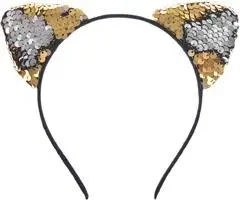 Opaska na głowę z kocimi uszami. Uszy pokryte są dekoracyjnymi cekinami w dwóch kolorach - srebrnym i złotym. Po obróceniu cekinów można wybrać kolor. Oryginalna ozdoba na bal karnawałowy, wieczór panieński, zabawę tematyczną.