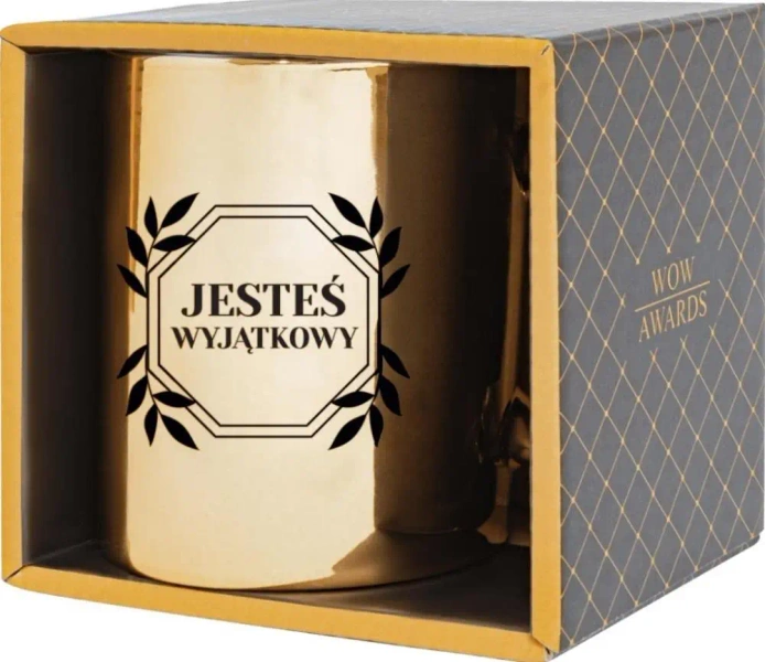 Personalizowany kubek prezentowy z napisem Jesteś Wyjątkowy - idealny upominek dla bliskiej osoby Odkryj wyjątkowy sposób, aby wyrazić swoje uczucia - z naszym personalizowanym kubkiem prezentowym "Jesteś Wyjątkowy". Idealny dla każdej ważnej i wyjątkowej osoby Twoim życiu, bez względu na okazję. Świetnie sprawdzi się jako upominek na szereg okazji dla Niej i dla Niego. Wygląd kubka Ten elegancki złoty kubek urzeka swoją elegancką, stylową kolorystyką i modnym designem. Złoty odcień, wzbogacony czarnym napisem, nadaje mu wyrafinowany charakter. Unikalny napis "Jesteś Wyjątkowy" wygrawerowany na kubku, dodaje osobistego akcentu. Specyfikacja: Materiał: Wysokiej jakości ceramika i porcelana Pojemność: 350 ml Opakowanie: Eleganckie kartonowe pudełko prezentowe Uwagi: Zabronione jest mycie w zmywarce