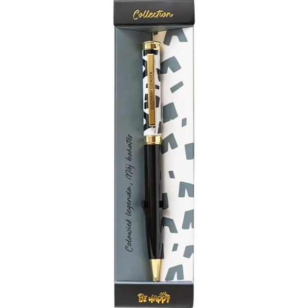 Elegancja tego długopisu tkwi w jego stylowej kolorystyce i nowoczesnym wzornictwie. Ciemny kolor wzbogacony złotymi akcentami oraz czarnym grawerem nadaje mu szyku i wyrafinowania. Specjalnie wygrawerowany napis "Kochany Dziadek" dodaje osobistego charakteru.