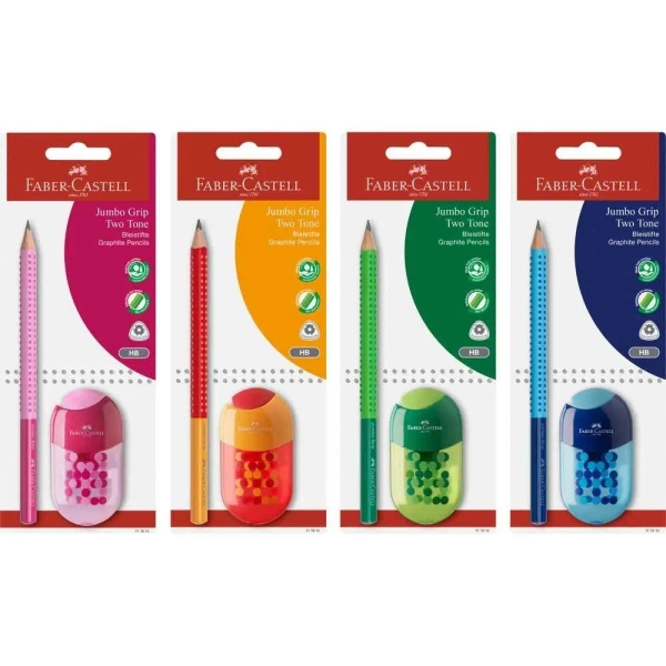 Odkryj zestaw ołówków grafitowych Jumbo Grip Two Tone od Faber-Castell, który wprowadza kolor do Twojego codziennego szkicowania i pisania. Ten wyjątkowy komplet zawiera ołówki w różnorodnych barwach: jasnozielono-zielony, pomarańczowo-czerwony, jasnoniebiesko-niebieski i jasnoróżowo-różowy. Całość dopełnia pasująca temperówka z gumką, wszystko zapakowane w praktyczne opakowanie blistrowe.